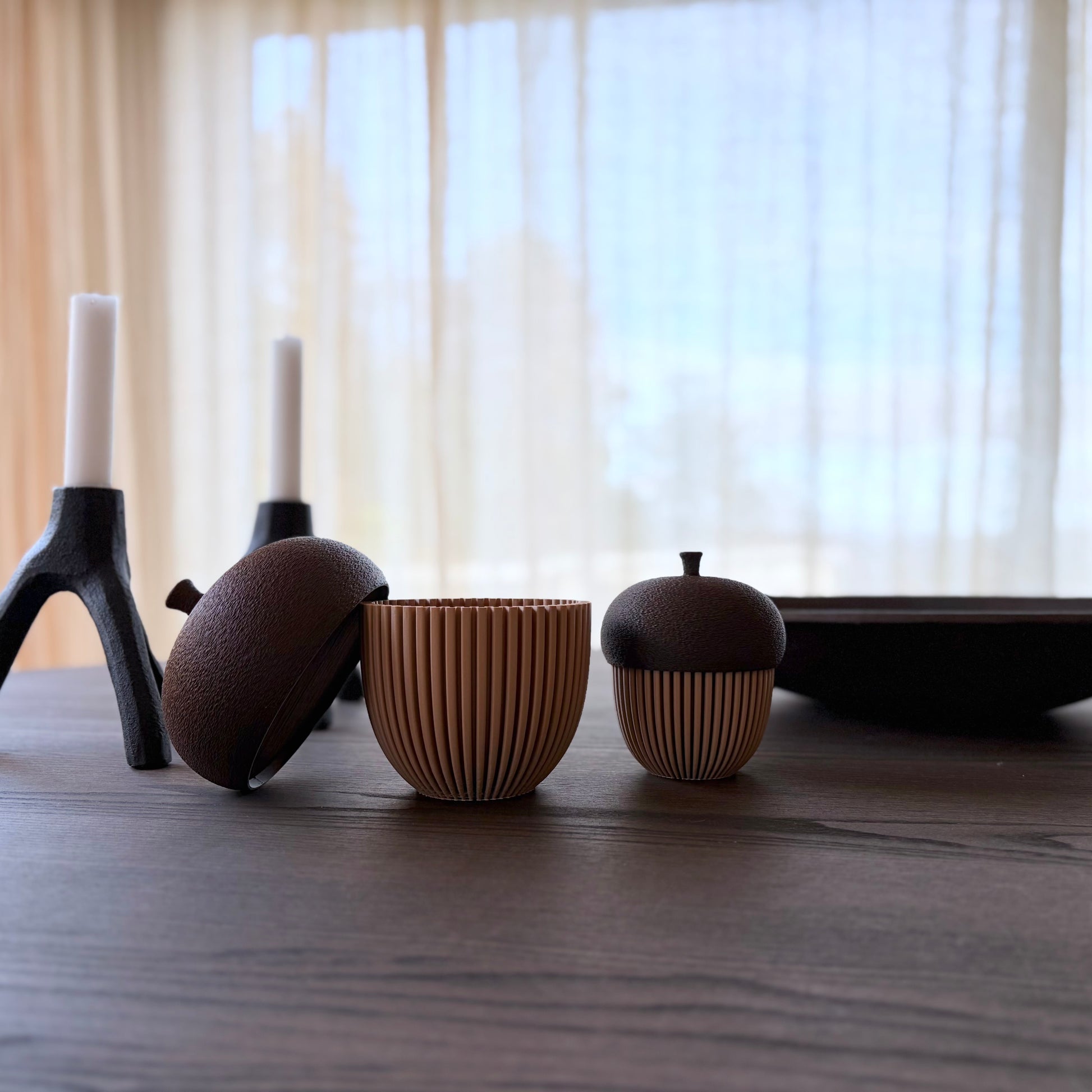 Dekorative eikenøtter inspirert av høstens varme fargetoner og naturens organiske former. Kroppen har en elegant rillet overflate i Latte Brown, mens lokket har en myk, teksturert finish i Brown Chocolate – printet i “fuzzy mode” for et naturtro uttrykk.