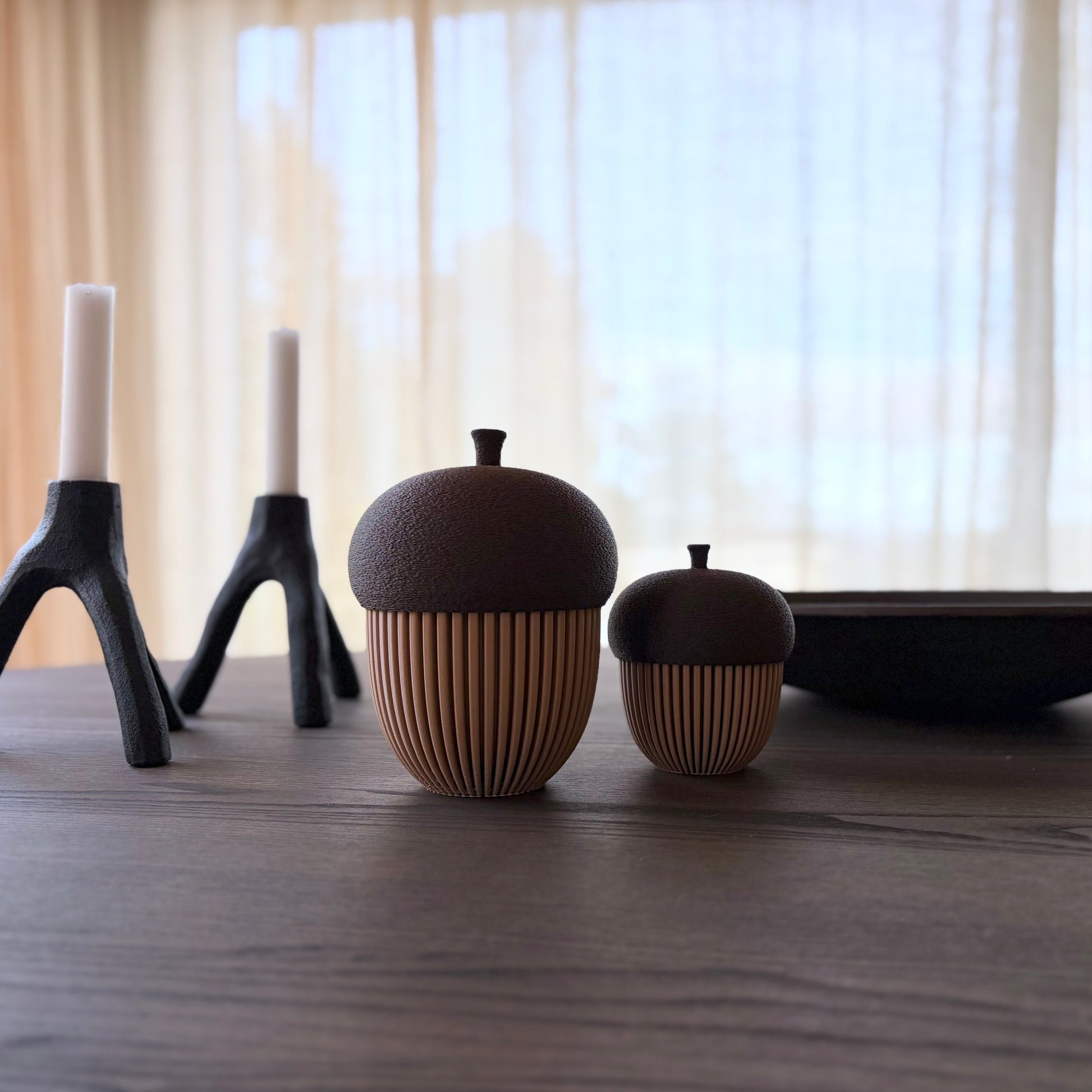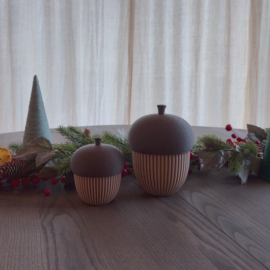 Dekorative eikenøtter inspirert av høstens varme fargetoner og naturens organiske former. Kroppen har en elegant rillet overflate i Latte Brown, mens lokket har en myk, teksturert finish i Brown Chocolate – printet i “fuzzy mode” for et naturtro uttrykk.