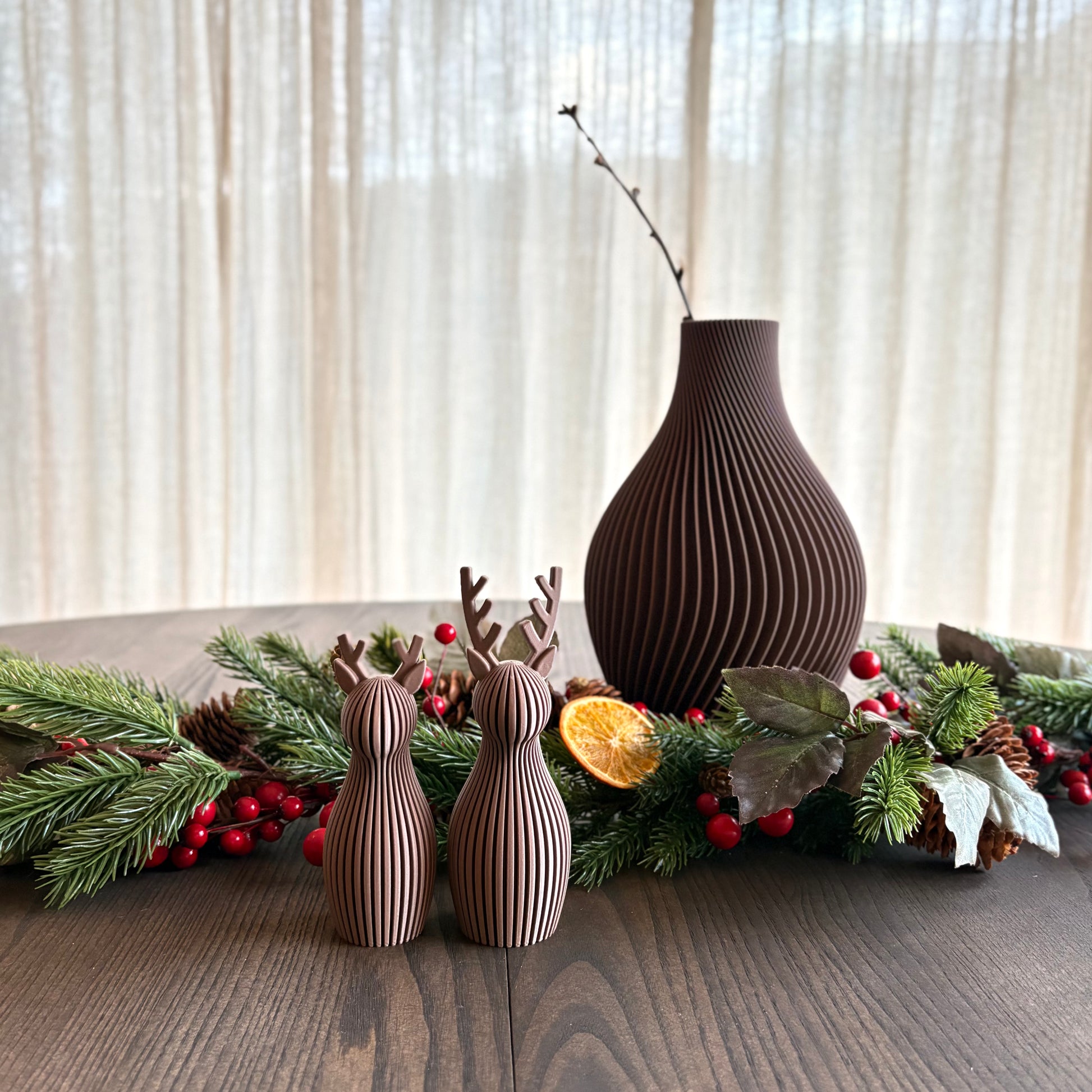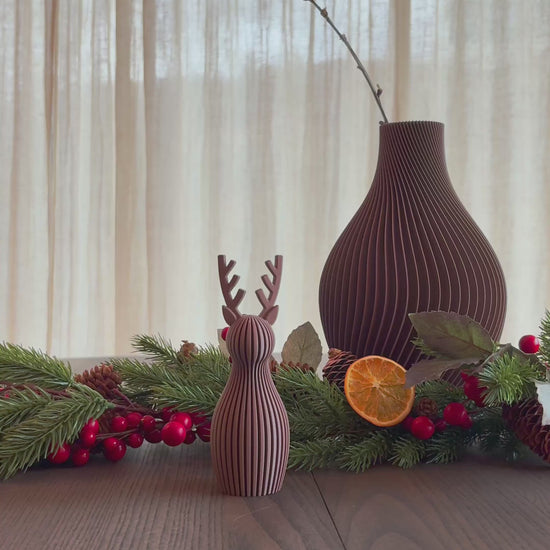 Reinsdyrene er 3D-printet i matt finish i fargen Dark Brown. Materialet er et biologisk nedbrytbart og miljøvennlig biopolymer, noe som gjør dem både pene og ansvarlig produsert. Den matte overflaten skaper et varmt og moderne uttrykk som passer inn i de fleste hjem.